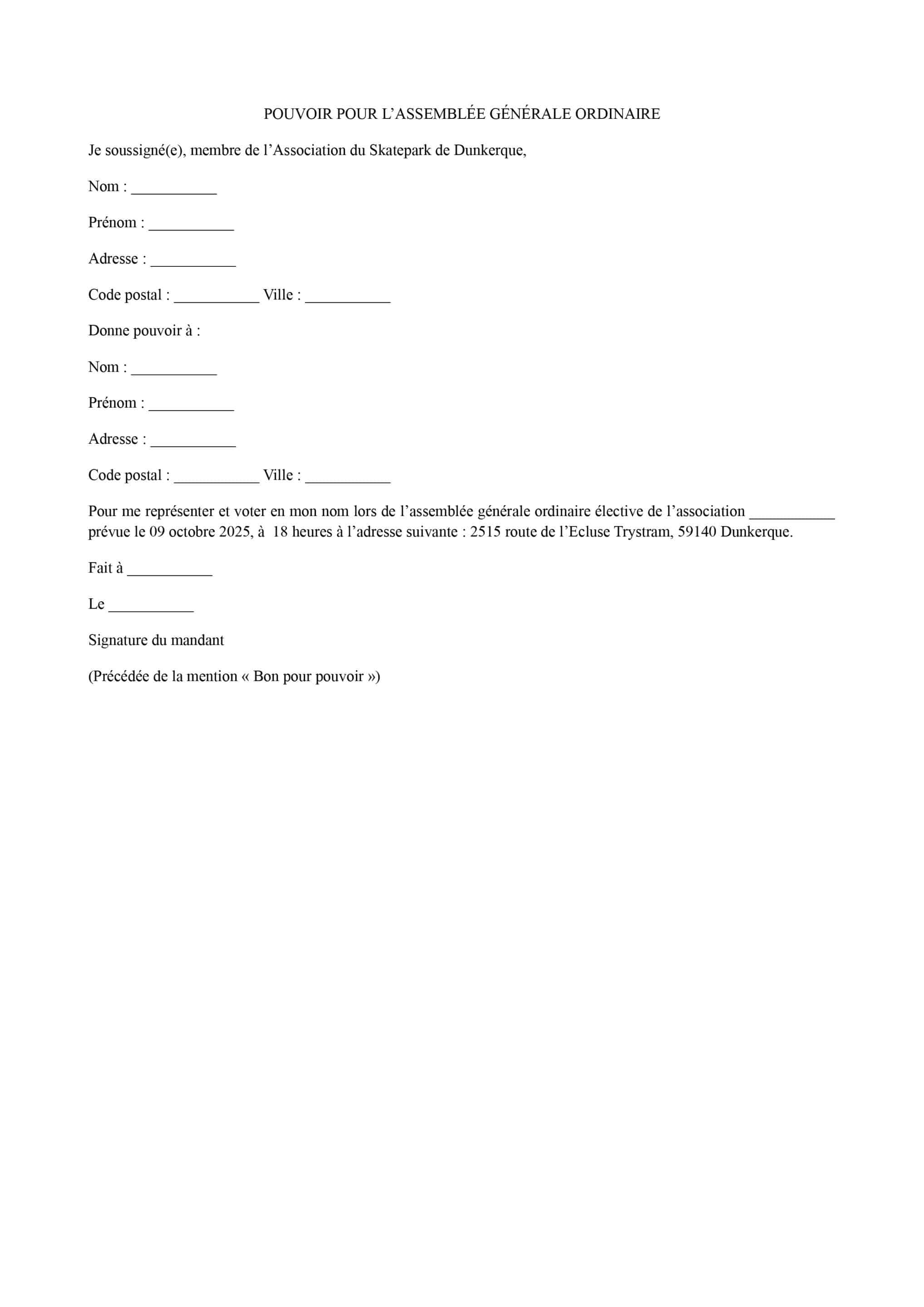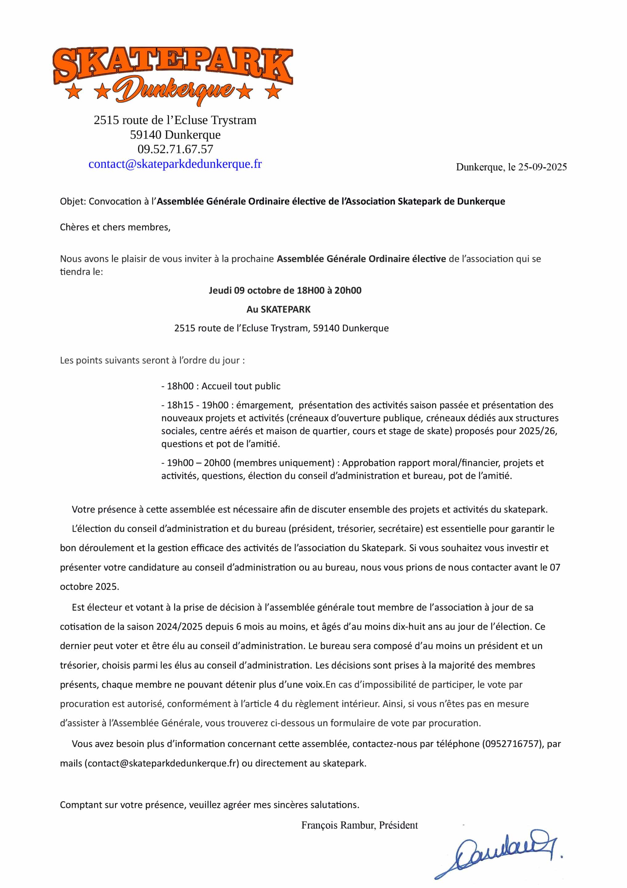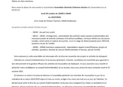 L’élection du conseil d’administration et du bureau (président, trésorier, secrétaire) est essentielle pour garantir le bon déroulement et la gestion efficace des activités de l’association du Skatepark. Si vous souhaitez vous investir et présenter votre candidature au conseil d’administration ou au bureau, nous vous prions de nous contacter avant le 07 octobre 2025.