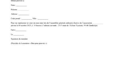 Est électeur et votant à la prise de décision à l’assemblée générale tout membre de l’association à jour de sa cotisation de la saison 2024/2025 depuis 6 mois au moins, et âgés d’au moins dix-huit ans au jour de l’élection. Ce dernier peut voter et être élu au conseil d’administration. Le bureau sera composé d’au moins un président et un trésorier, choisis parmi les élus au conseil d’administration. Les décisions sont prises à la majorité des membres présents, chaque membre ne pouvant détenir plus d’une voix. En cas d’impossibilité de participer, le vote par procuration est autorisé, conformément à l’article 4 du règlement intérieur. Ainsi, si vous n’êtes pas en mesure d’assister à l’Assemblée Générale, vous trouverez ci-dessous un formulaire de vote par procuration.